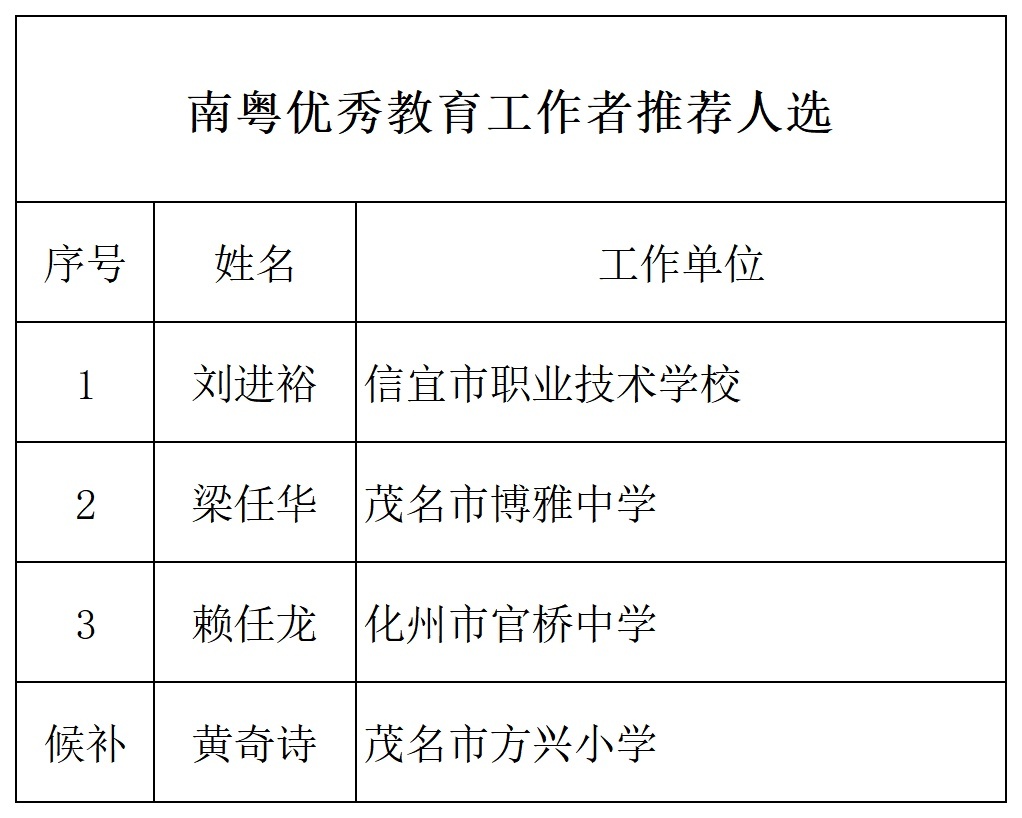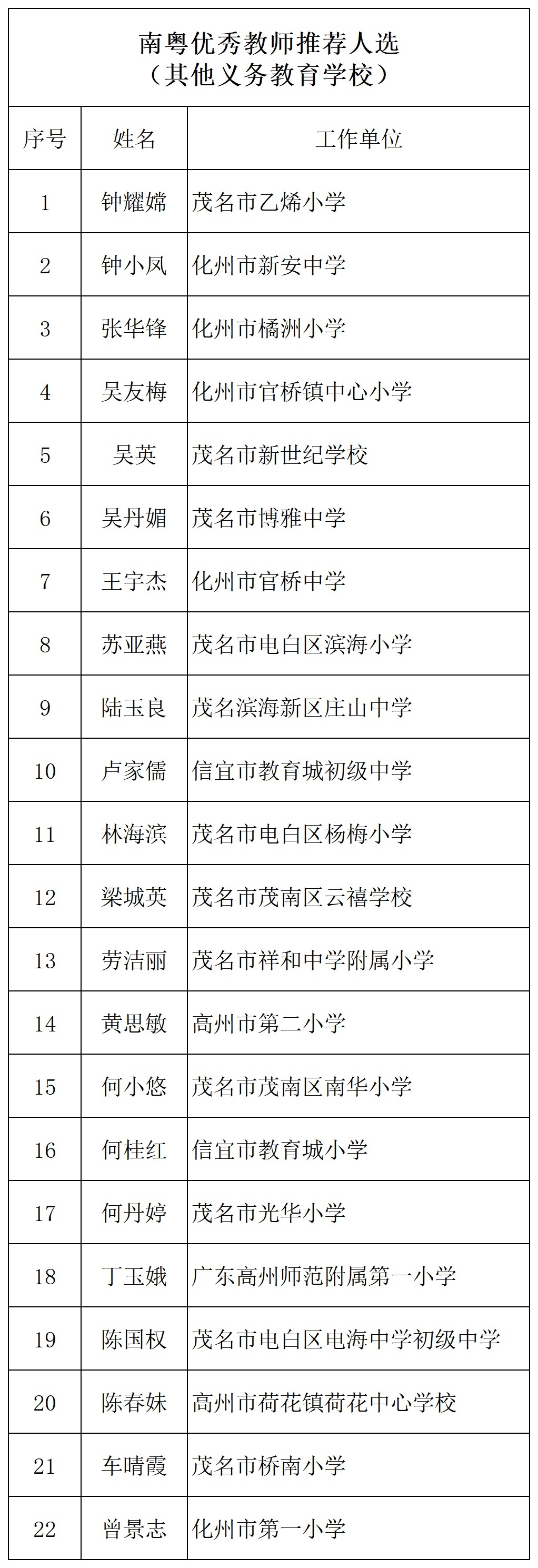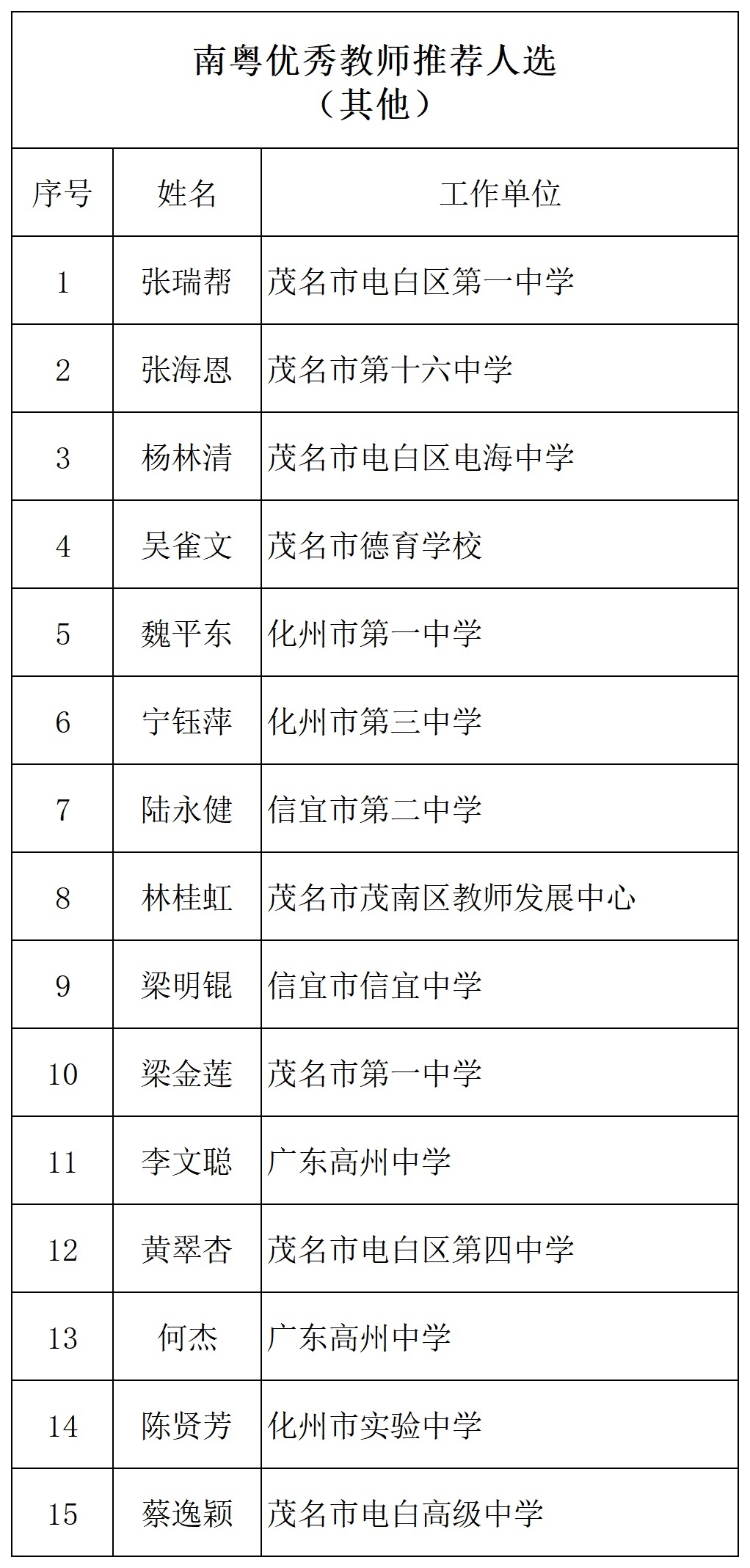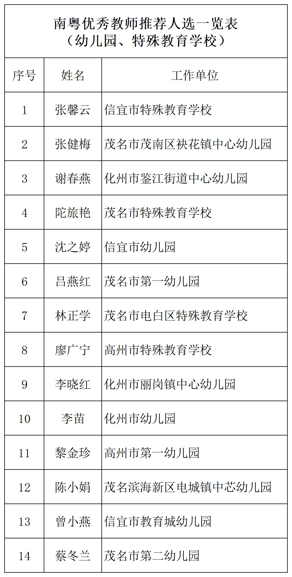 根据《关于做好南粤优秀教师(优秀教育工作者)暨特级教师评选表彰工作的通知》文件要求,茂名市教育局坚持公开、公平、公正的原则,严格按照自下而上、逐级审核、择优推荐的方式组织全市有关学校开展评选推荐南粤优秀教师(优秀教育工作者)活动。