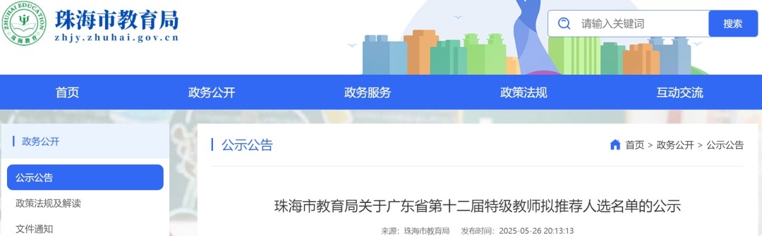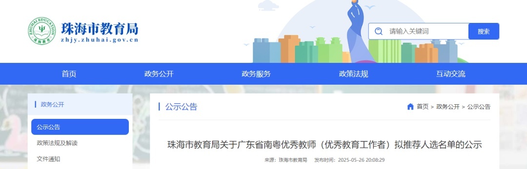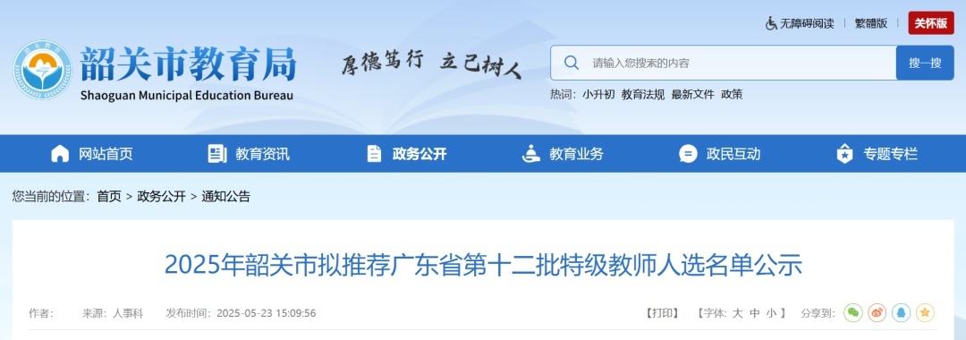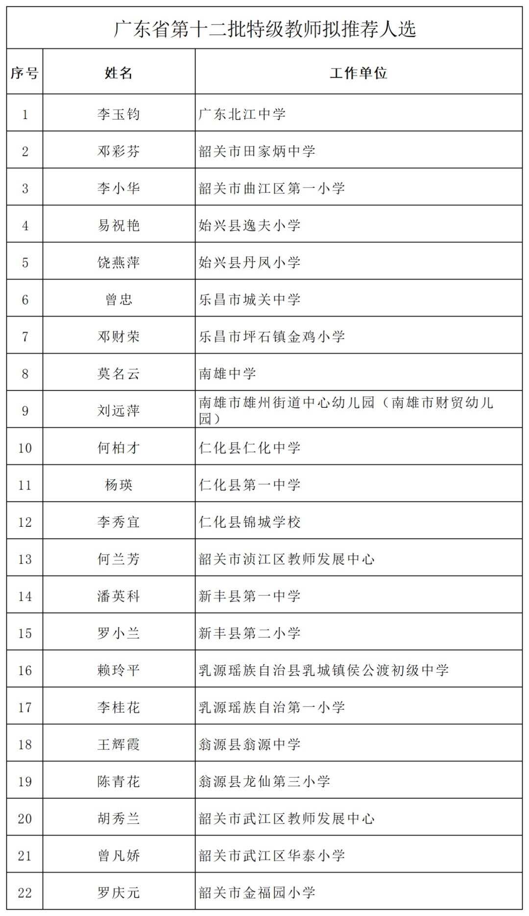 根据省人社厅、省教育厅联合下发的《关于做好南粤优秀教师(优秀教育工作者)暨特级教师评选表彰工作的通知》,经自下而上民主推荐、逐级评审推荐、市教育局组织考察和评委会评选方式,遴选李玉钧等22名同志拟推荐为广东省第十二批特级教师人选(名单见附件),现予以公示。公示时间为2025年5月26日至5月30日。