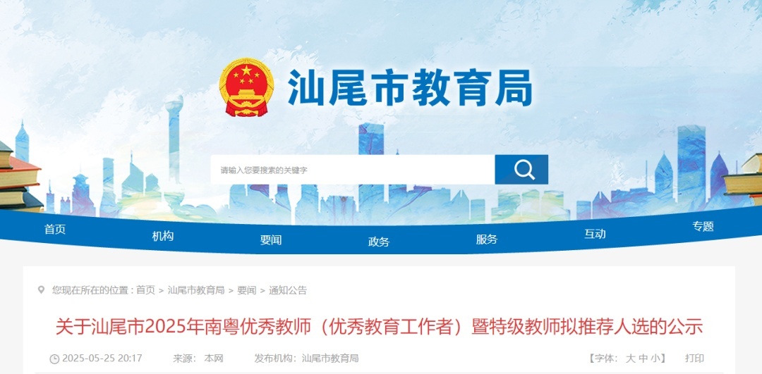 根据省人社厅、教育厅关于做好南粤优秀教师(优秀教育工作者)暨特级教师评选表彰工作的通知精神,经自愿报名、自下而上,逐级推荐、市南粤优秀教师(优秀教育工作者)评选推荐委员会推荐,并报市委教育工委研究同意,蔡雪冰等24位同志拟作为广东省南粤优秀教师推荐人选、李永奇等3位同志拟作为广东省南粤优秀教育工作者推荐人选。现予以公示,公示时间从2025年5月27日至6月3日止。