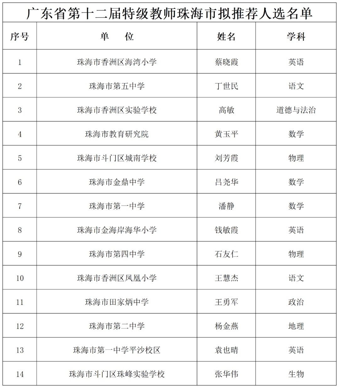 附件:广东省第十二届特级教师珠海市拟推荐人选名单
