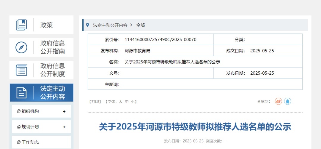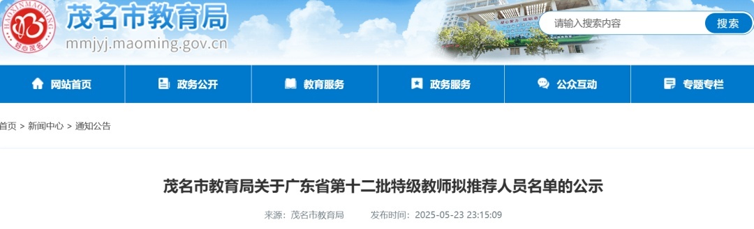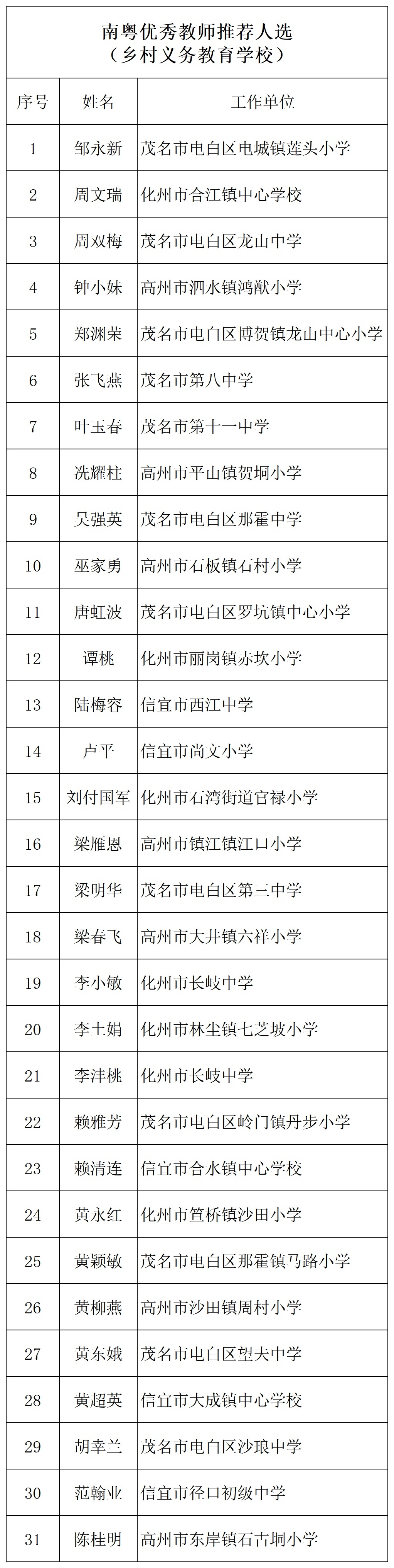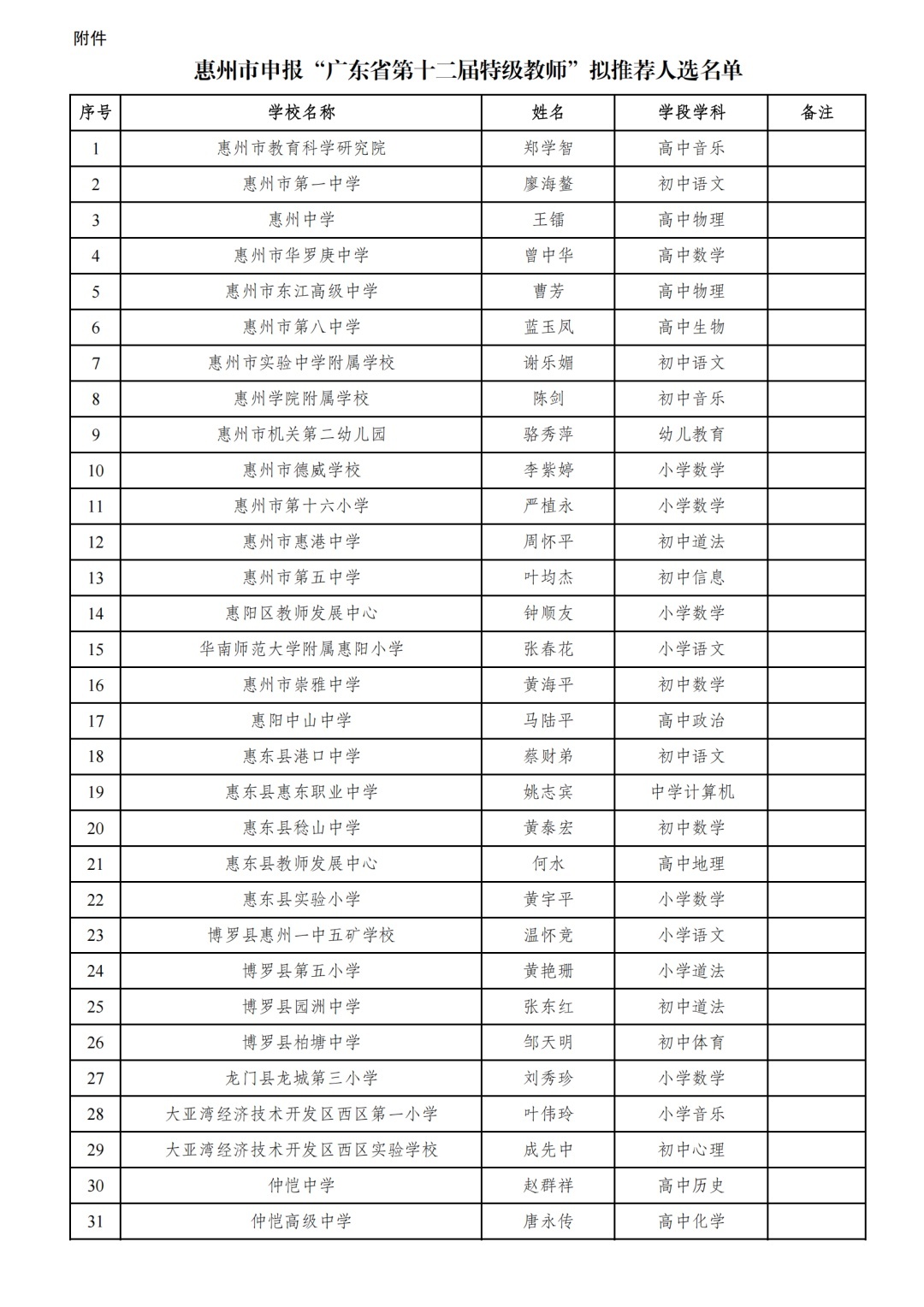 根据《广东省人力资源社会保障厅、广东省教育厅关于做好南粤优秀教师(优秀教育工作者)暨特级教师评选表彰工作的通知》有关要求,经学校和县(区)教育部门逐级推荐,市评审委员会专家组考察评审和市教育局党组研究,同意郑学智等31名教师(校长、园长、教研员)为“广东省第十二届特级教师”拟推荐人选(见附件)。现对以上拟推荐人选予以公示,公示时间为2025年5月27日-6月3日。