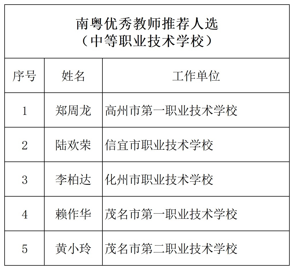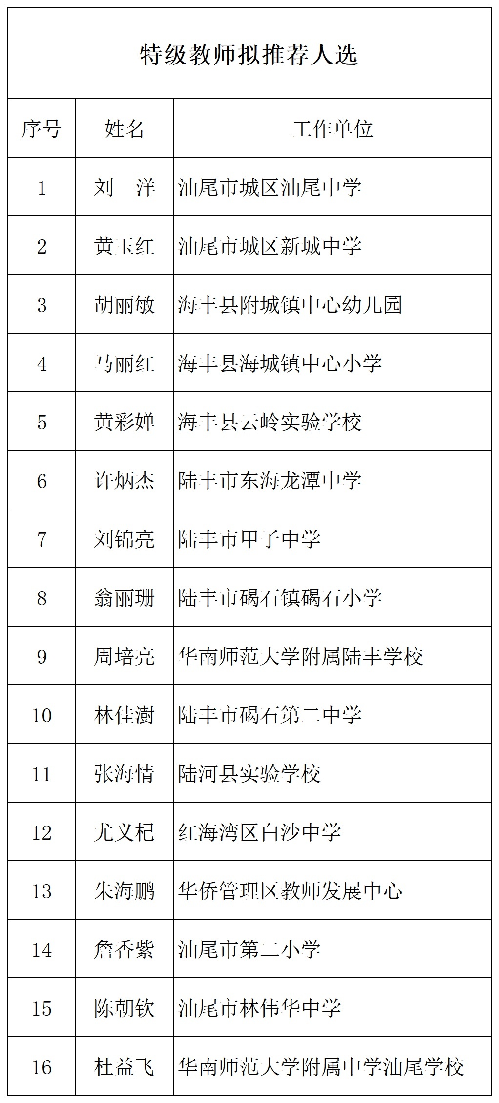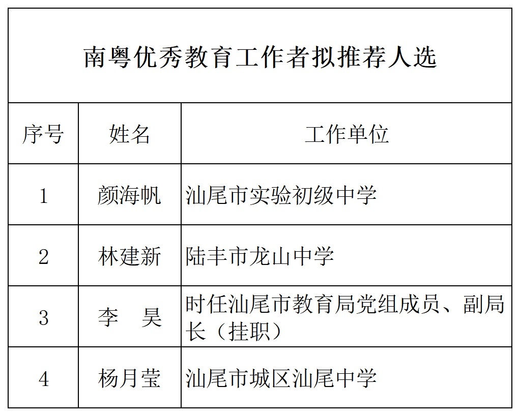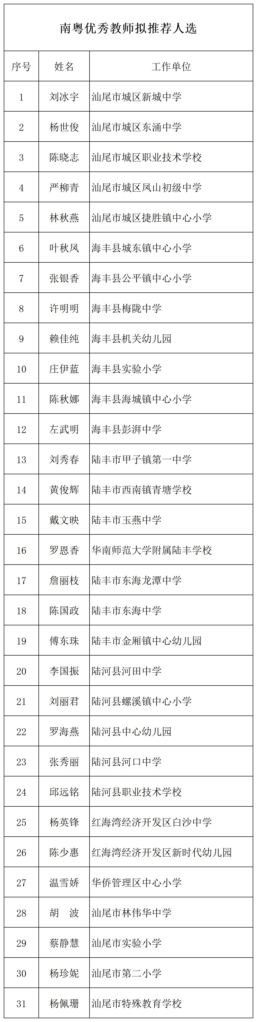 附件:汕尾市2025年南粤优秀教师(优秀教育工作者)暨特级教师拟推荐人员名单