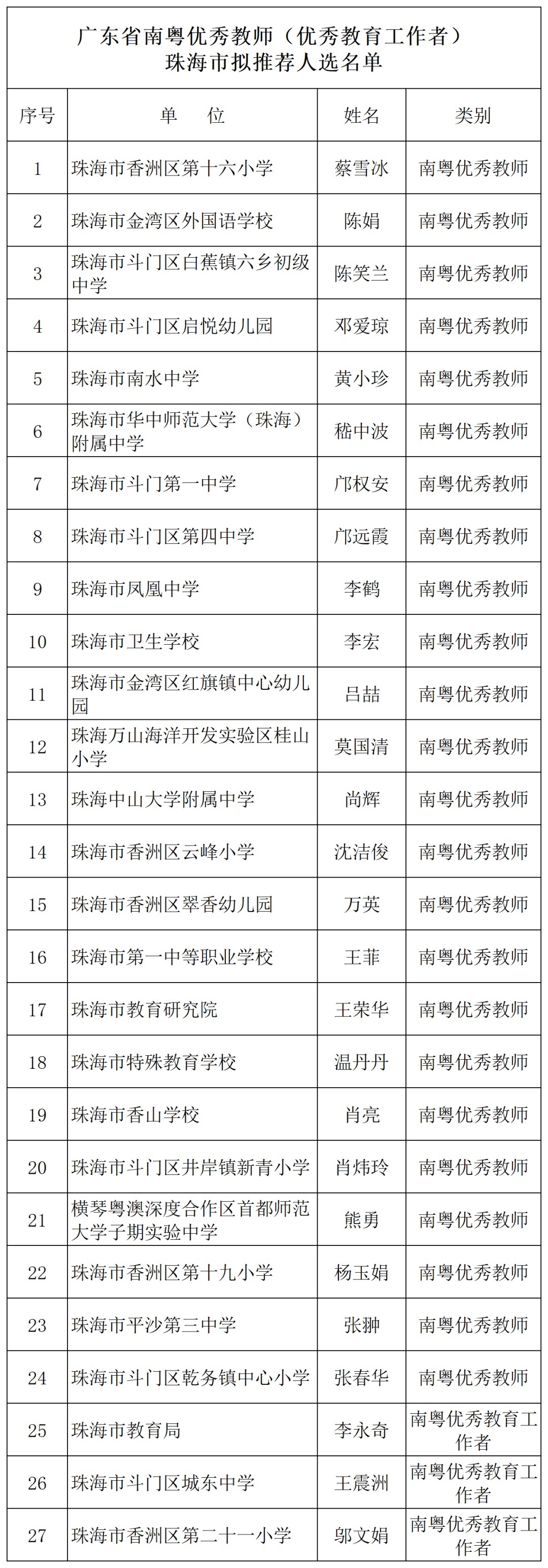 附件:广东省南粤优秀教师(优秀教育工作者)珠海市拟推荐人选名单