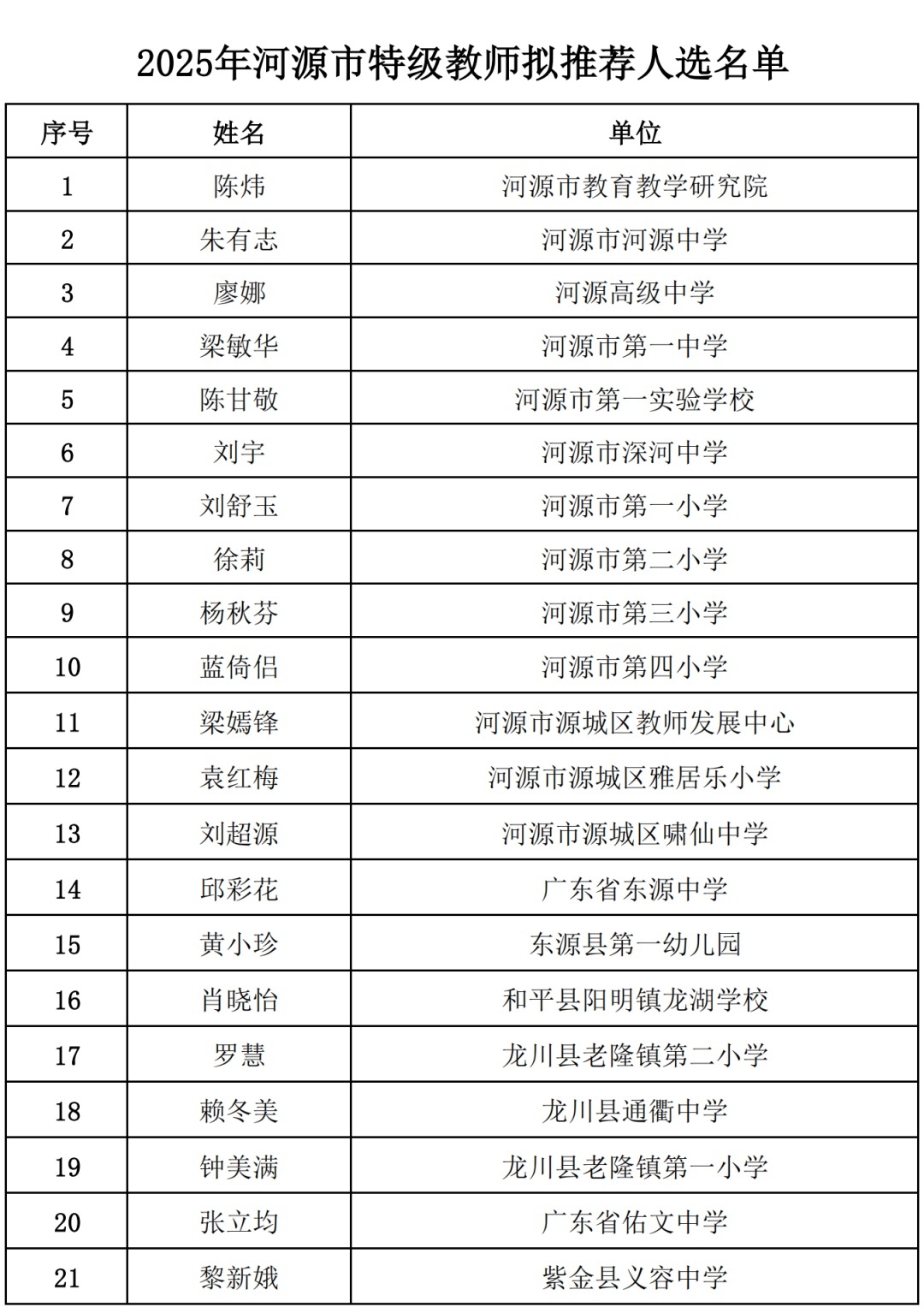 根据《关于做好南粤优秀教师(优秀教育工作者)暨特级教师评选表彰工作的通知》文件精神,在各地各校推荐的基础上,经评审小组审核和遴选等环节,拟推荐陈炜等23名同志为2025年河源市特级教师人选,现予以公示。