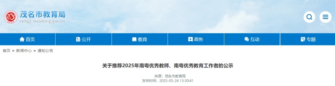 根据广东省人力资源和社会保障厅、广东省教育厅《关于做好南粤优秀教师(优秀教育工作者)暨特级教师评选表彰工作的通知》要求,经自下而上逐级推荐、市教育局党组研究,拟推荐51名教师为南粤优秀教师、南粤优秀教育工作者和广东省第十二批特级教师人选。现将拟推荐人员名单予以公示,公示时间为2025年5月26日至5月30日。